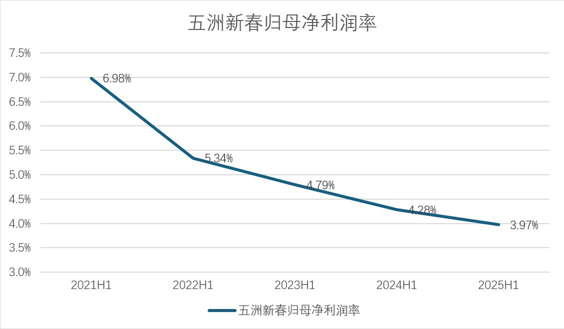 盈利效率的下滑也值得注意。2025 年上半年,公司归母净利率仅 3.97%,创下近五年同期新低 —— 对比 2021 年上半年 6.98%、2022 年上半年 5.34%、2023 年上半年 4.79%、2024 年上半年 4.28% 的净利率水平,五年间净利率累计下滑 3.01 个百分点,降幅超 43%。