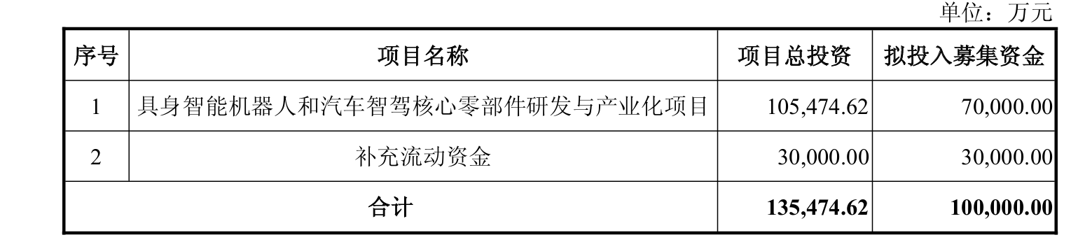 公司打算募资 10 亿元,其中 7 亿元用于 “具身智能机器人和汽车智驾核心零部件研发与产业化项目”,3 亿元用于补充流动资金。