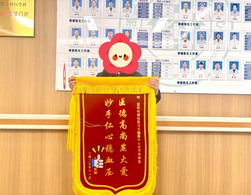 “医德高尚显大爱,妙手仁心稳血压”,这面由患者朱阿姨敬赠的锦旗,满含对家庭医生史洋洋的深切感激。作为辖区居民健康“守门人”,史洋洋始终以贴心服务守护群众安康。