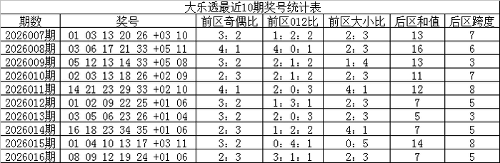 012路分析:上期前区奖号012路比为3:1:1,最近两周2路前区奖号走势较热,0路前区奖号表现较冷。