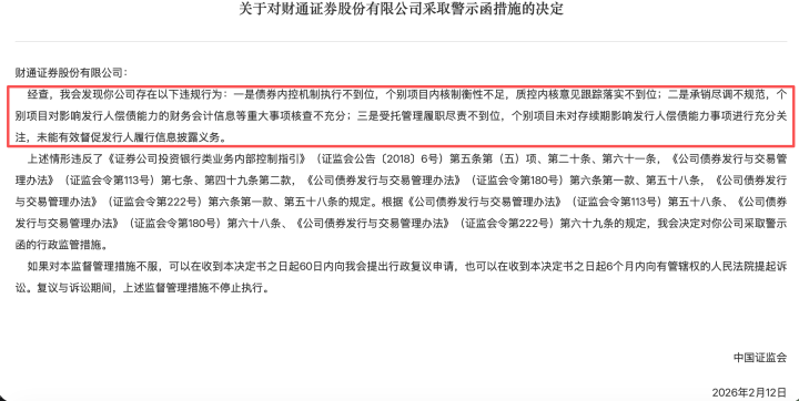 2月13日,证监会披露3张债券业务违规罚单,太平洋证券、中天国富、财通证券同日领罚,均被采取出具警示函的行政监管措施。