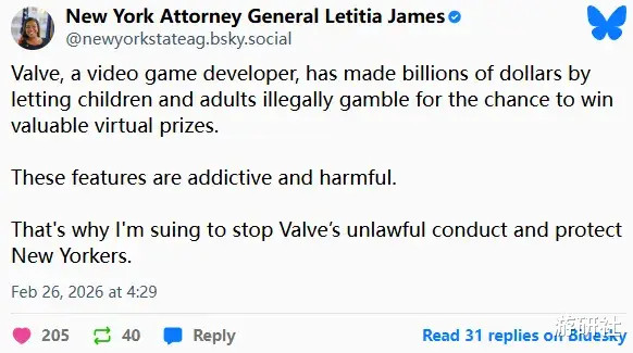 就在今日,美国纽约州总检察长Letitia James在多个社交平台上正式宣布对游戏公司V社提起诉讼,指控旗下的游戏违反了该州的赌博法。